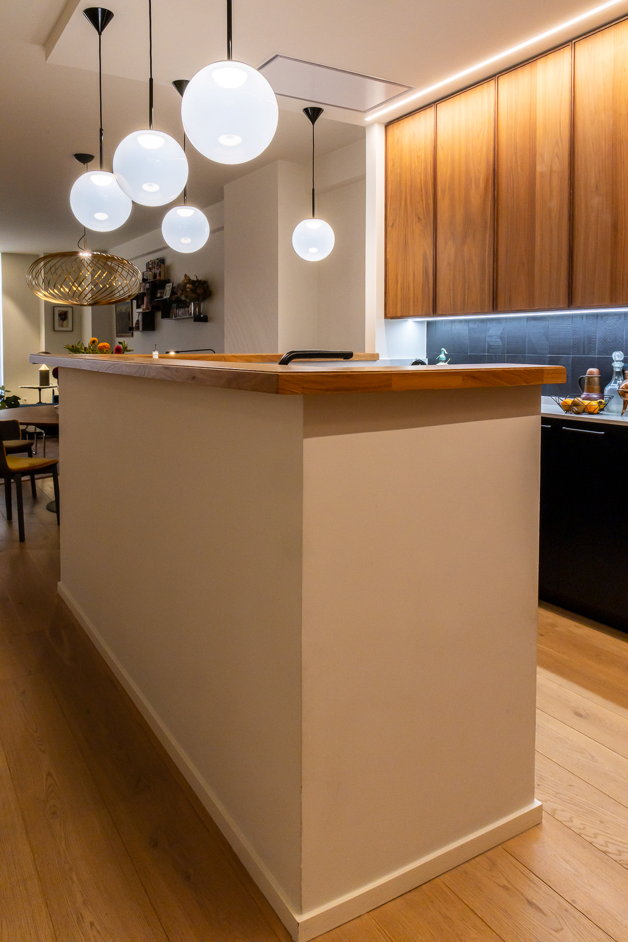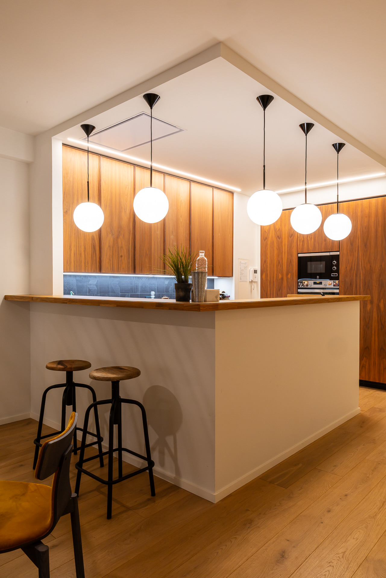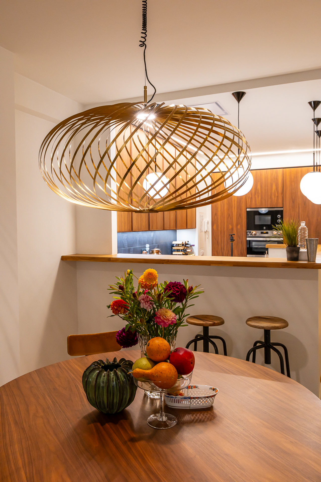 Para conseguir la mejor distribución tendríamos que situar la cocina en la misma entrada. Le dimos un aire de barra de bar con lamparas colgantes para semiocultarla y hacer de esta «sorpresa» inicial un espacio central, acogedor y muy funcional
