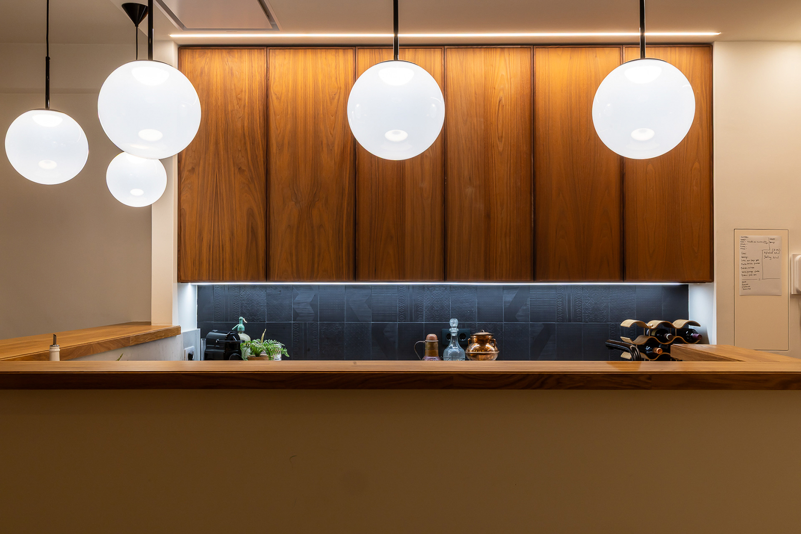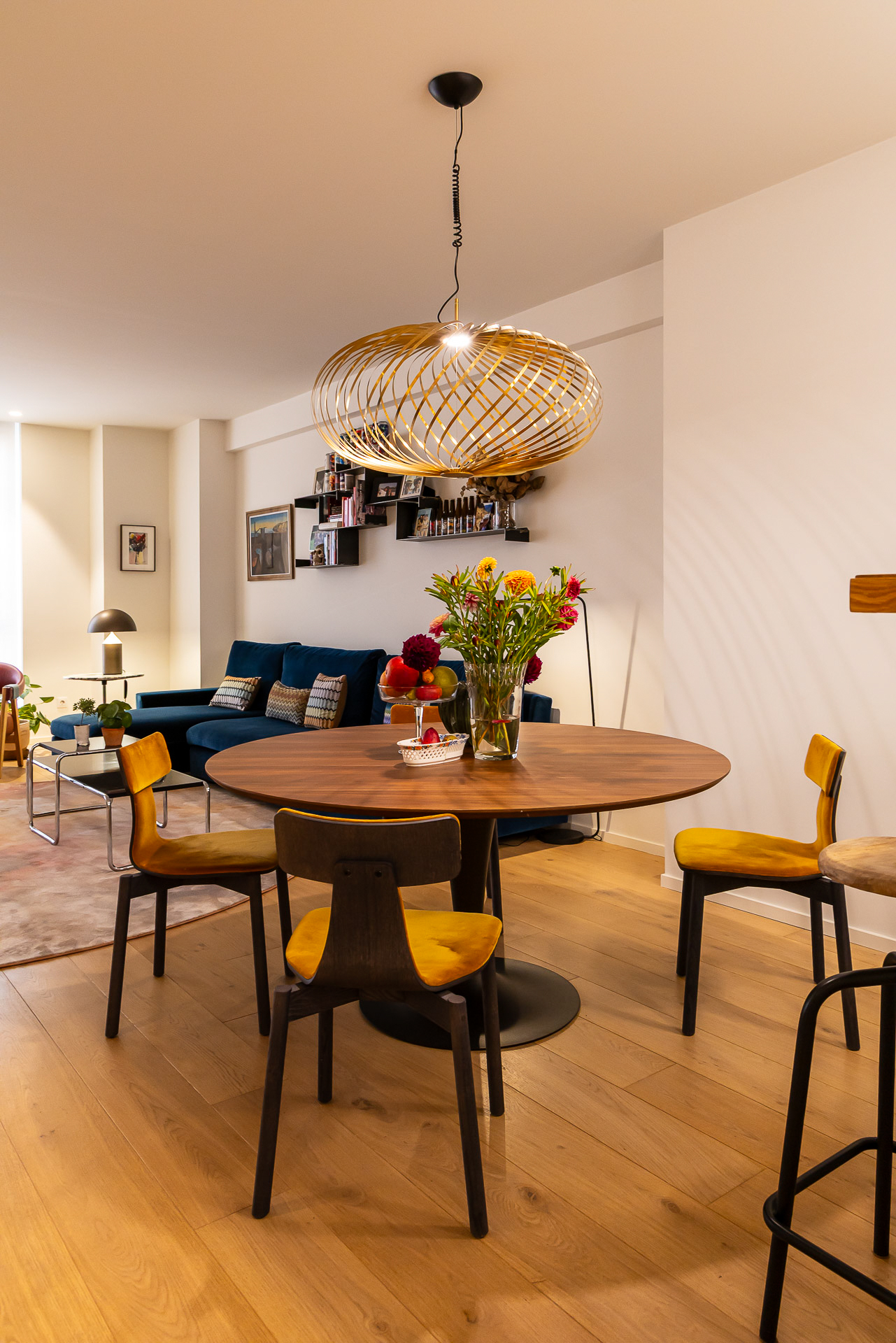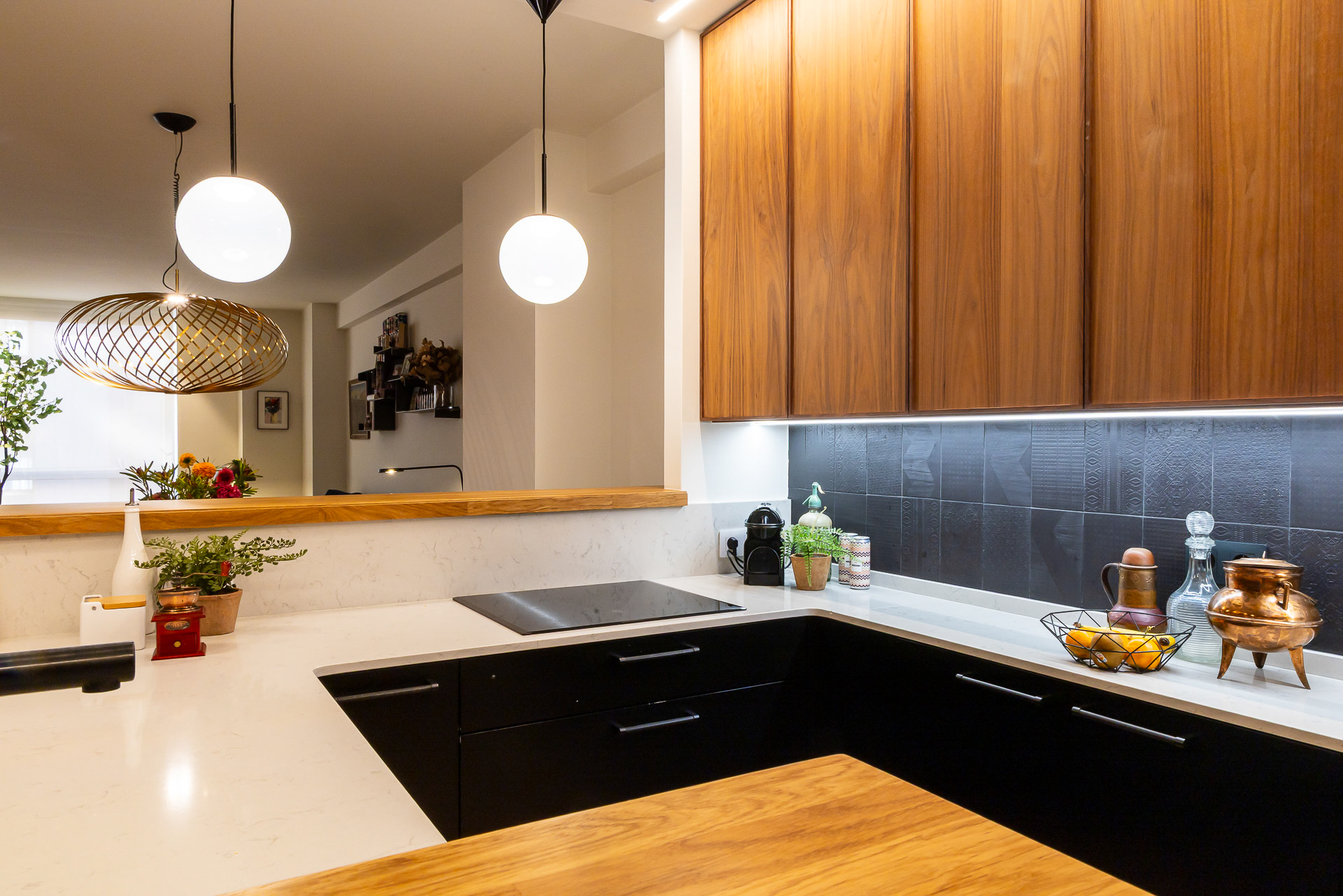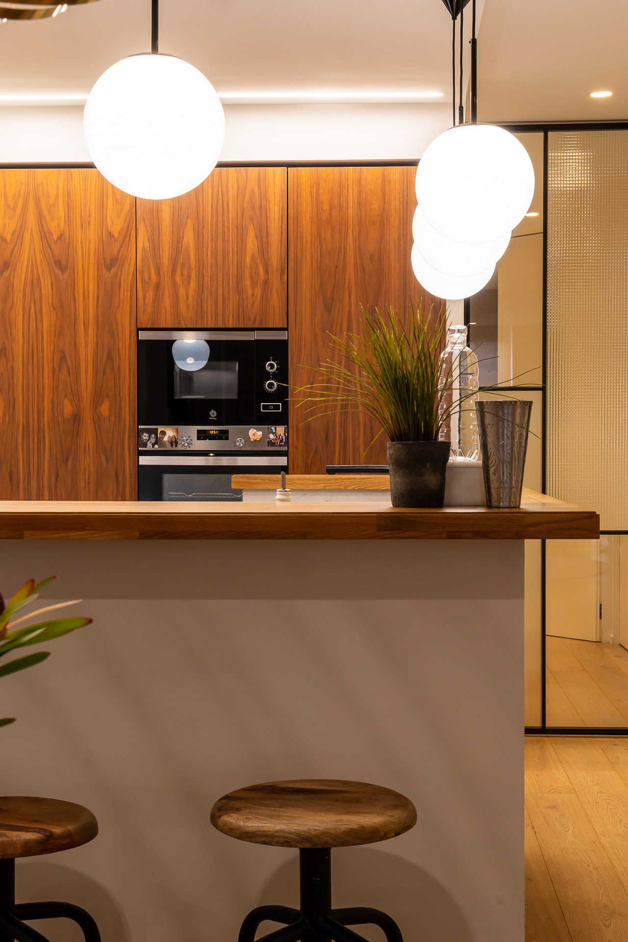 Para conseguir la mejor distribución tendríamos que situar la cocina en la misma entrada. Le dimos un aire de barra de bar con lamparas colgantes para semiocultarla y hacer de esta «sorpresa» inicial un espacio central, acogedor y muy funcional
