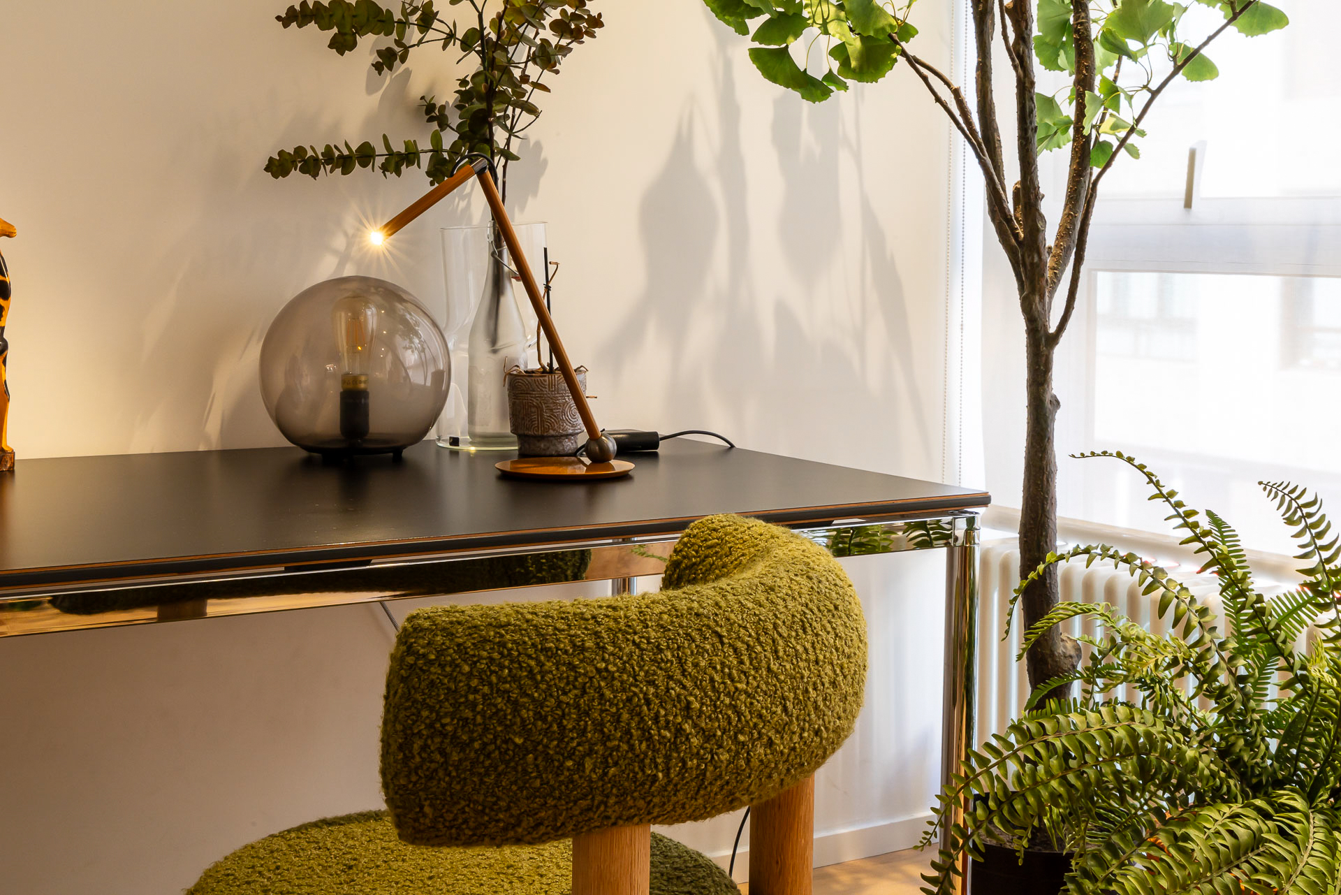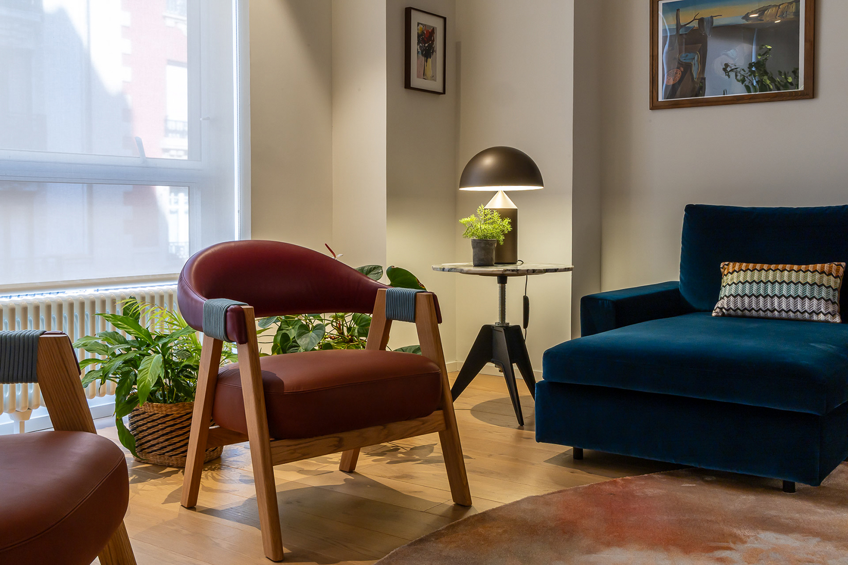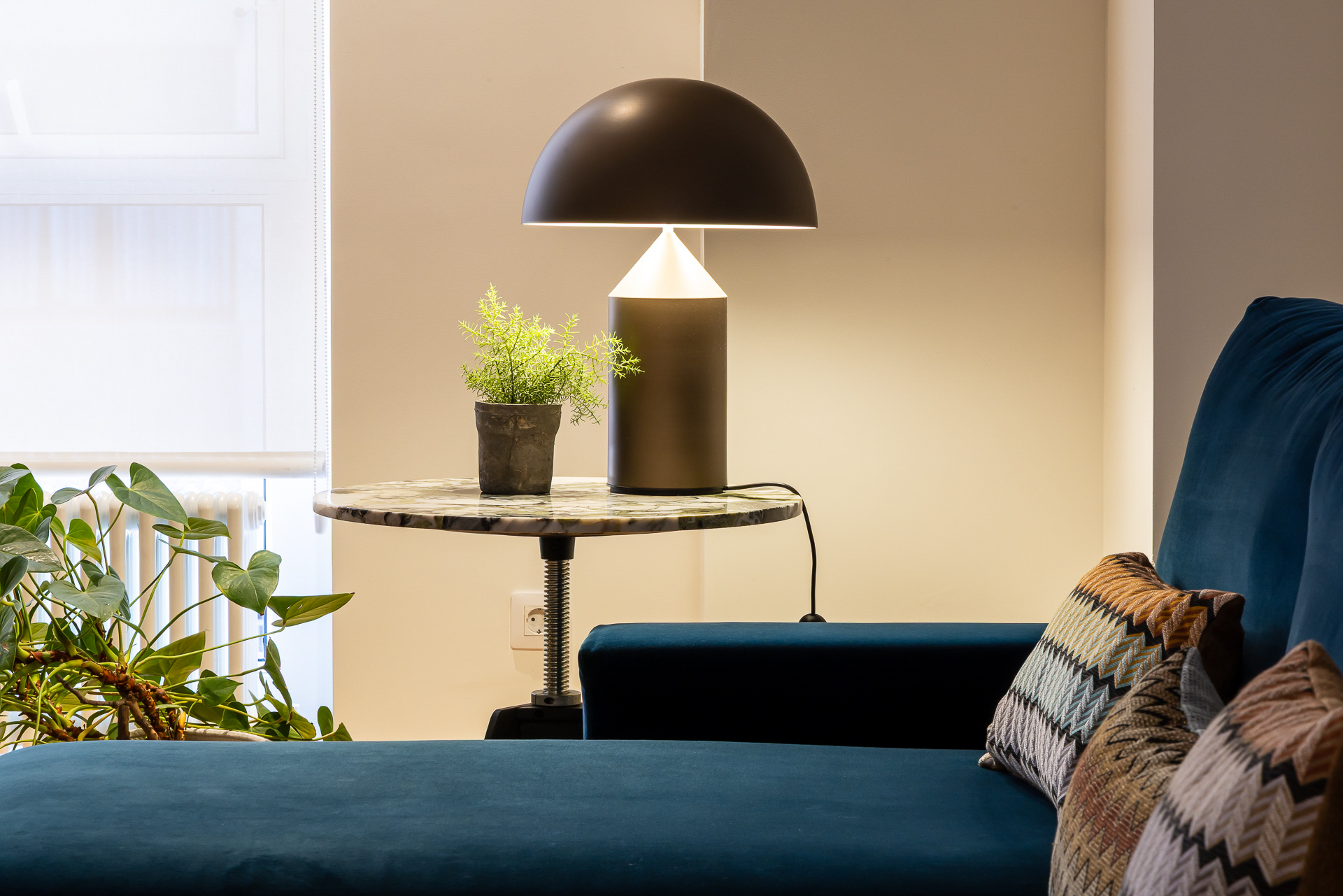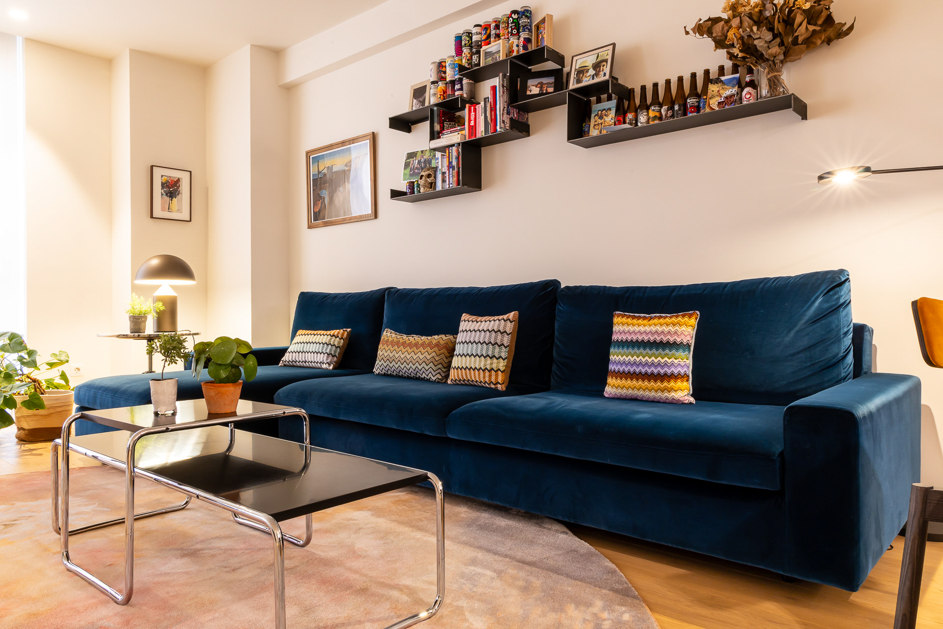 Para conseguir la mejor distribución tendríamos que situar la cocina en la misma entrada. Le dimos un aire de barra de bar con lamparas colgantes para semiocultarla y hacer de esta «sorpresa» inicial un espacio central, acogedor y muy funcional