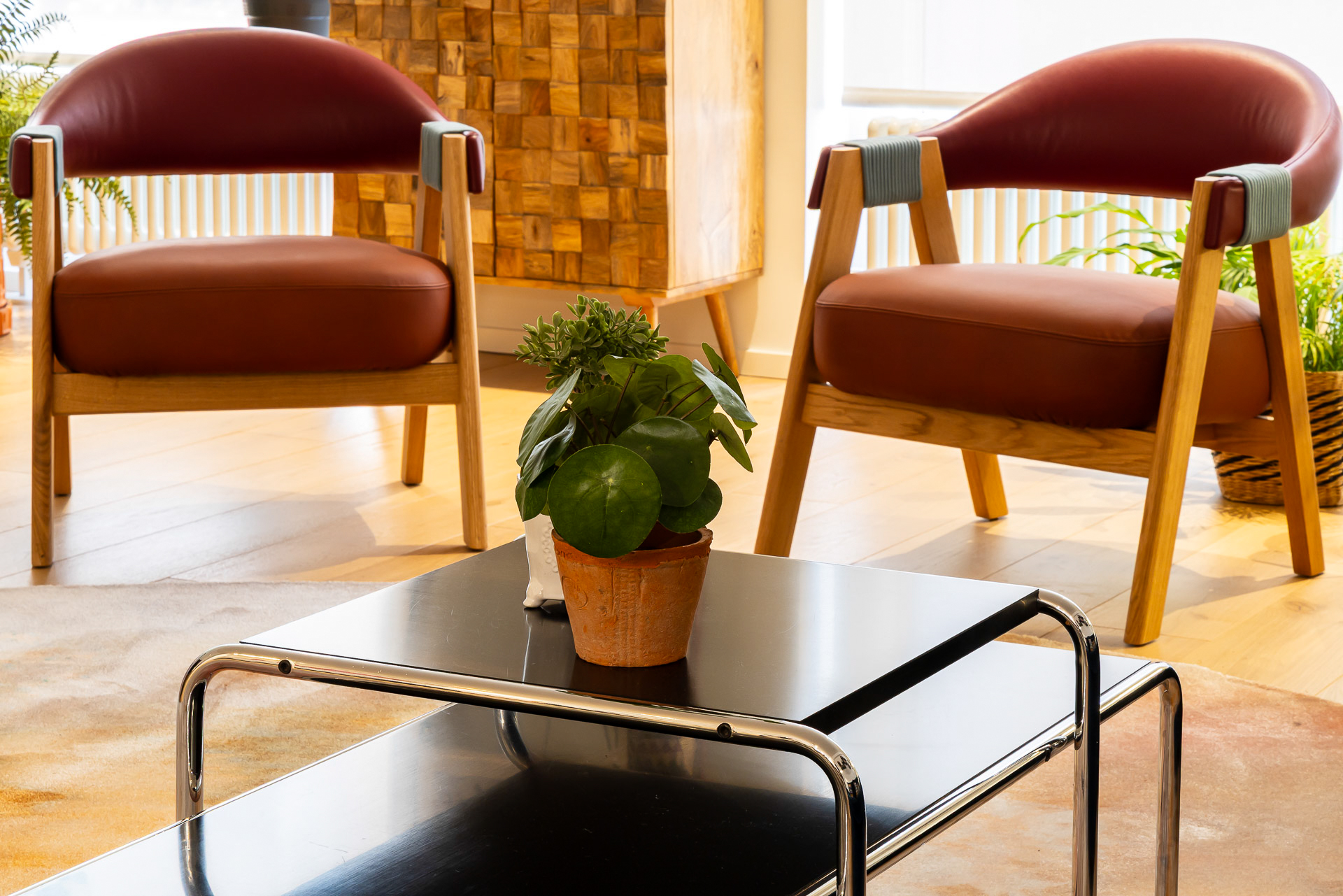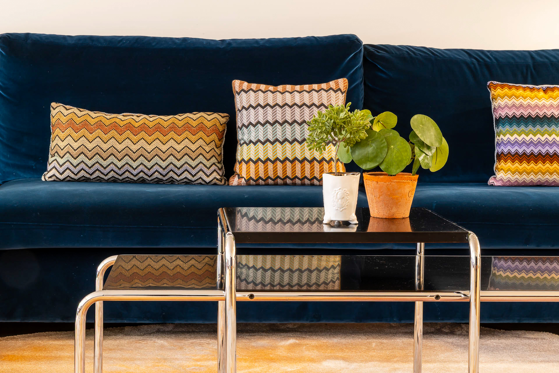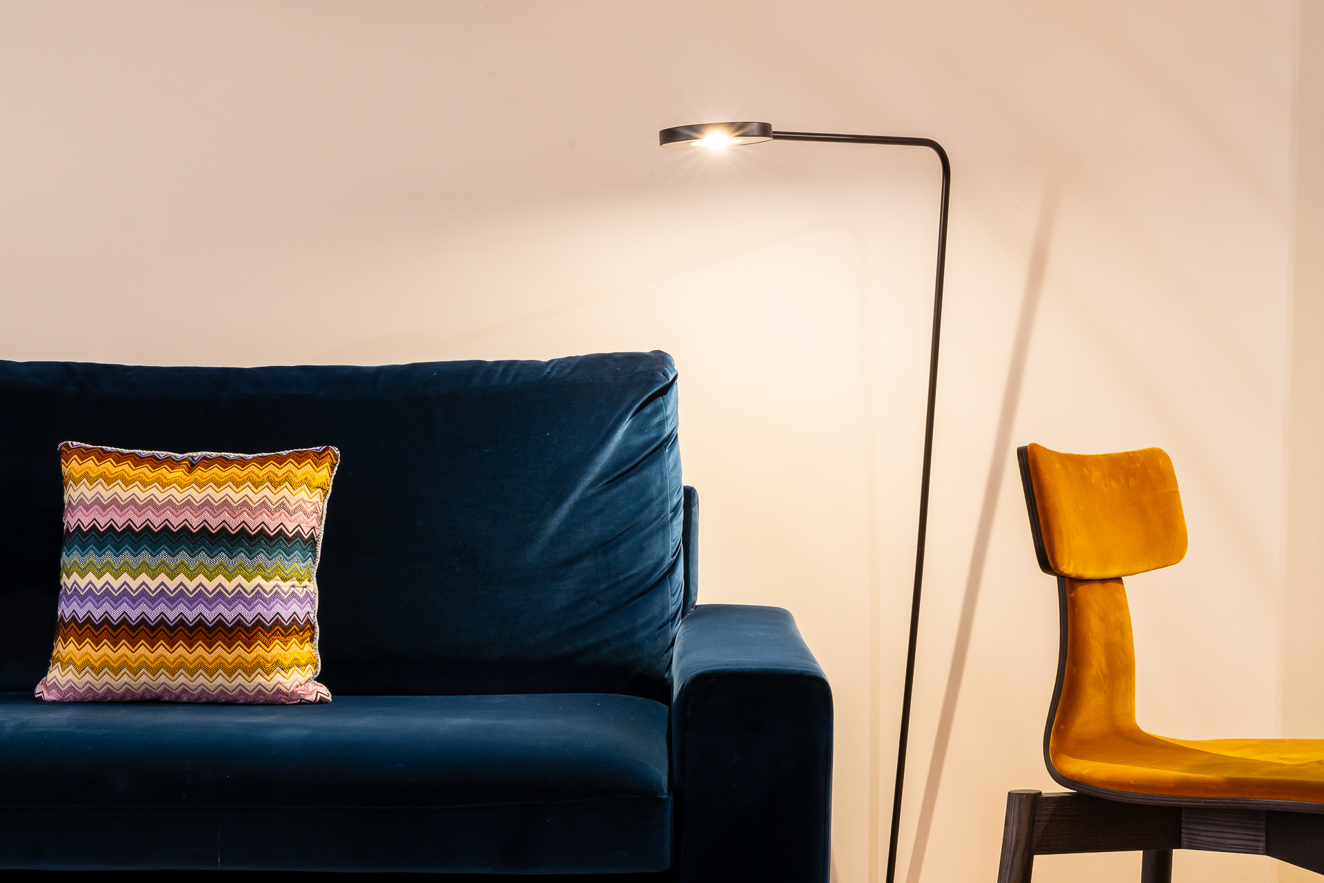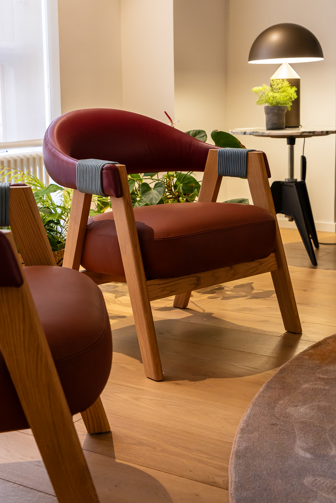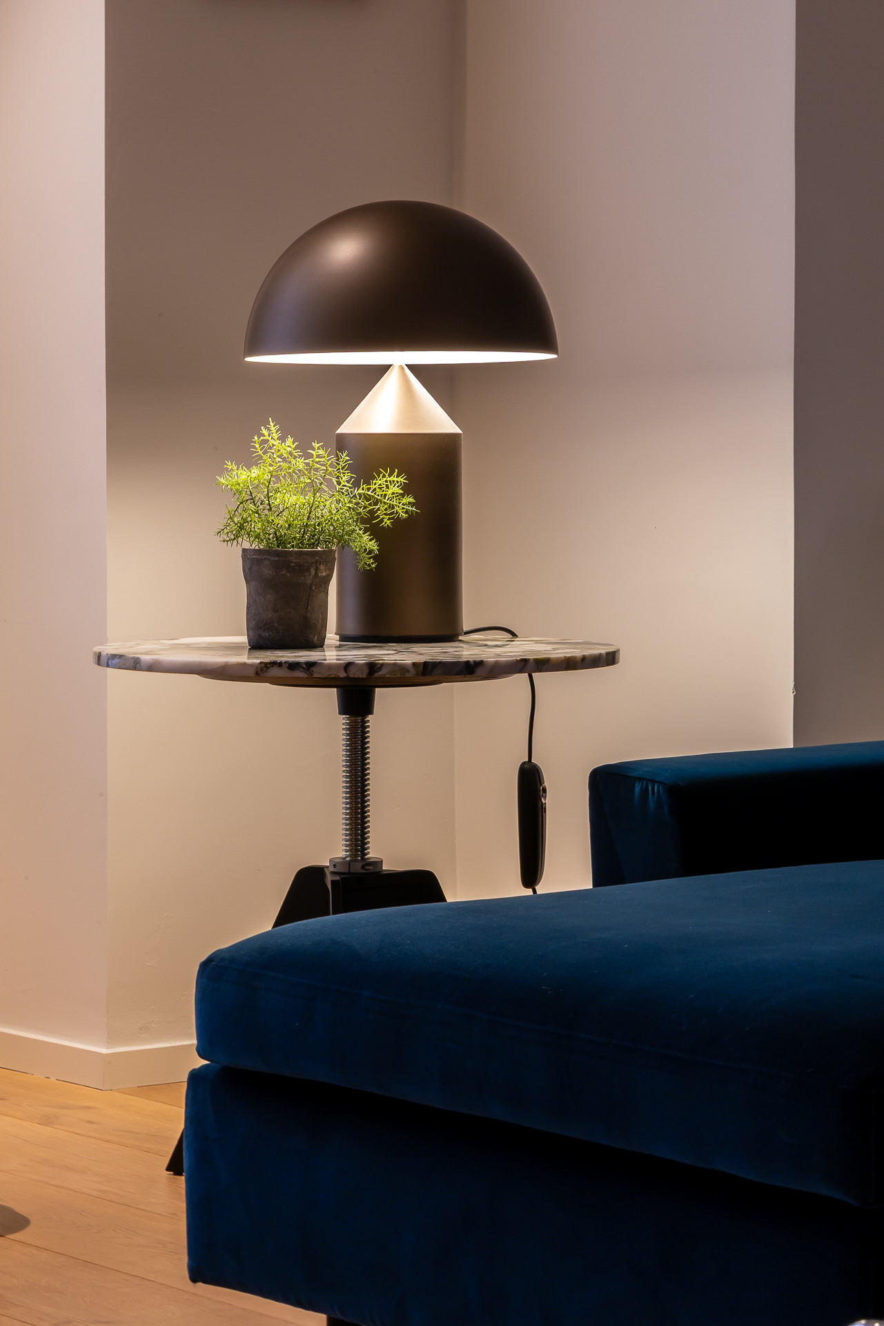 Para conseguir la mejor distribución tendríamos que situar la cocina en la misma entrada. Le dimos un aire de barra de bar con lamparas colgantes para semiocultarla y hacer de esta «sorpresa» inicial un espacio central, acogedor y muy funcional
